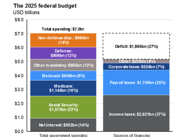 Looking at the chart below, our $7 trillion budget includes $1.807 trillion in interest payments and other mandatory spending. Then we add in $3.576 trillion for things politics won’t touch: defense, Social Security, and Medicare.